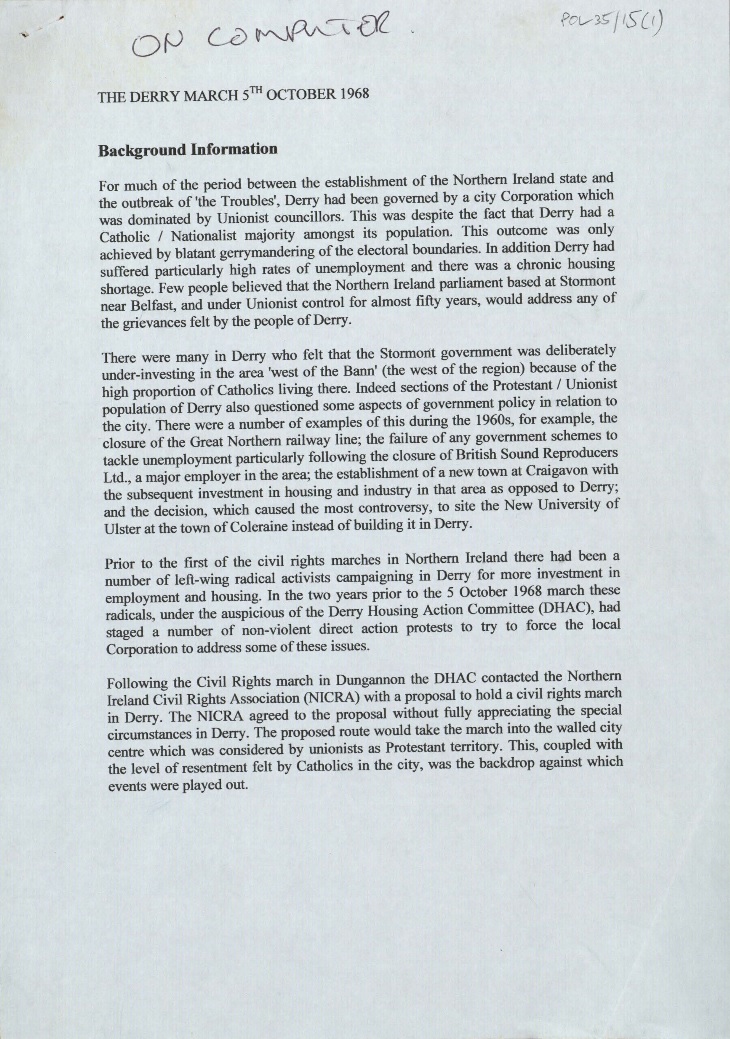 Typescript (computer offprint) essay (no author) dealing with the Derry March of 5 October 1968, discussing the event, its background and implications, including four photographs; also listing chronology of events from February 1967 to 11 December 1968; structured bibliography (latest publication 1997). Arguing this march spelled the beginning of 'The Troubles', and pointing to press coverage which alerted many in UK and the Republic to a situation not well understood until then. (With caption by [Éamonn Downey] 'on computer'.)
