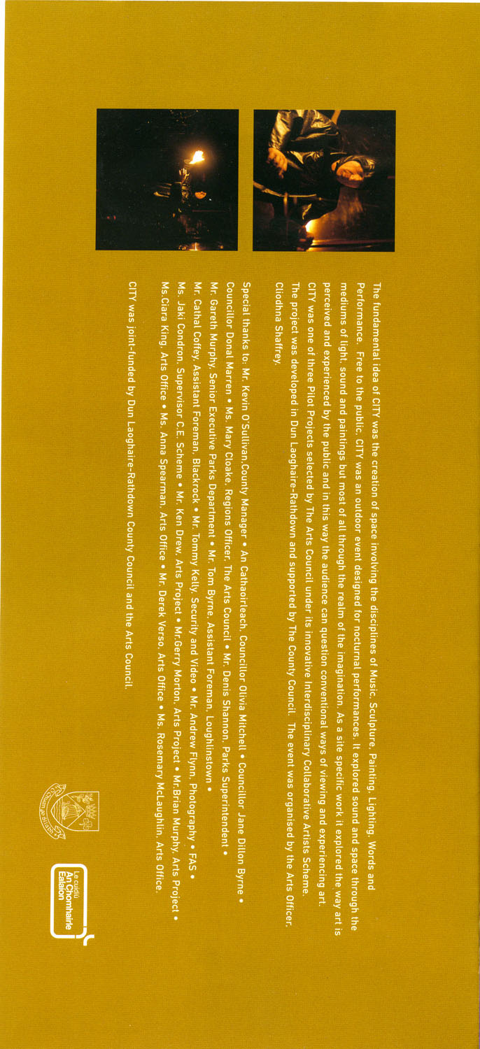 Printed programme from CITY - A multi-media performance piece exploring the relationship of music, performance and art through the theme of the City, devised by the Pan Pan Company.