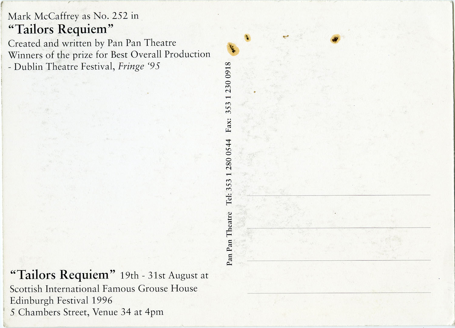 Black-and-white printed postcard for Tailors Requiem by Pan Pan Theatre Company