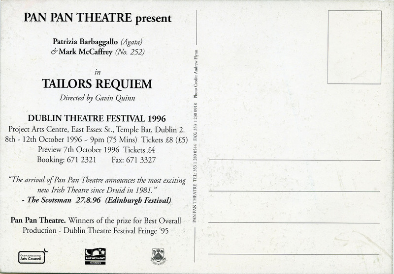 Black-and-white printed postcard for Tailors Requiem by Pan Pan Theatre Company