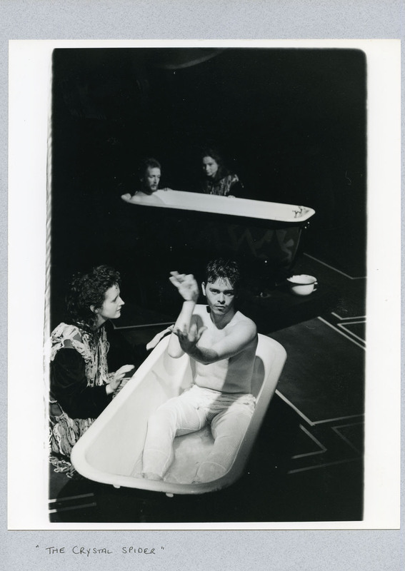 A black-and-white photograph on grey cardboard of Carmel Flanaghan and Senan Dunne in Pan Pan Theatre Company's The Crystal Spider