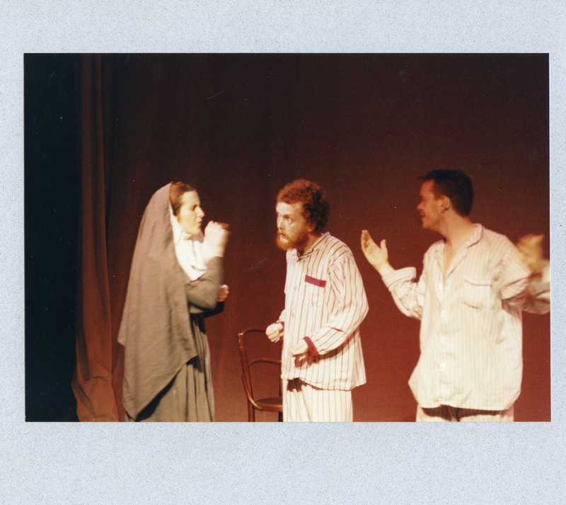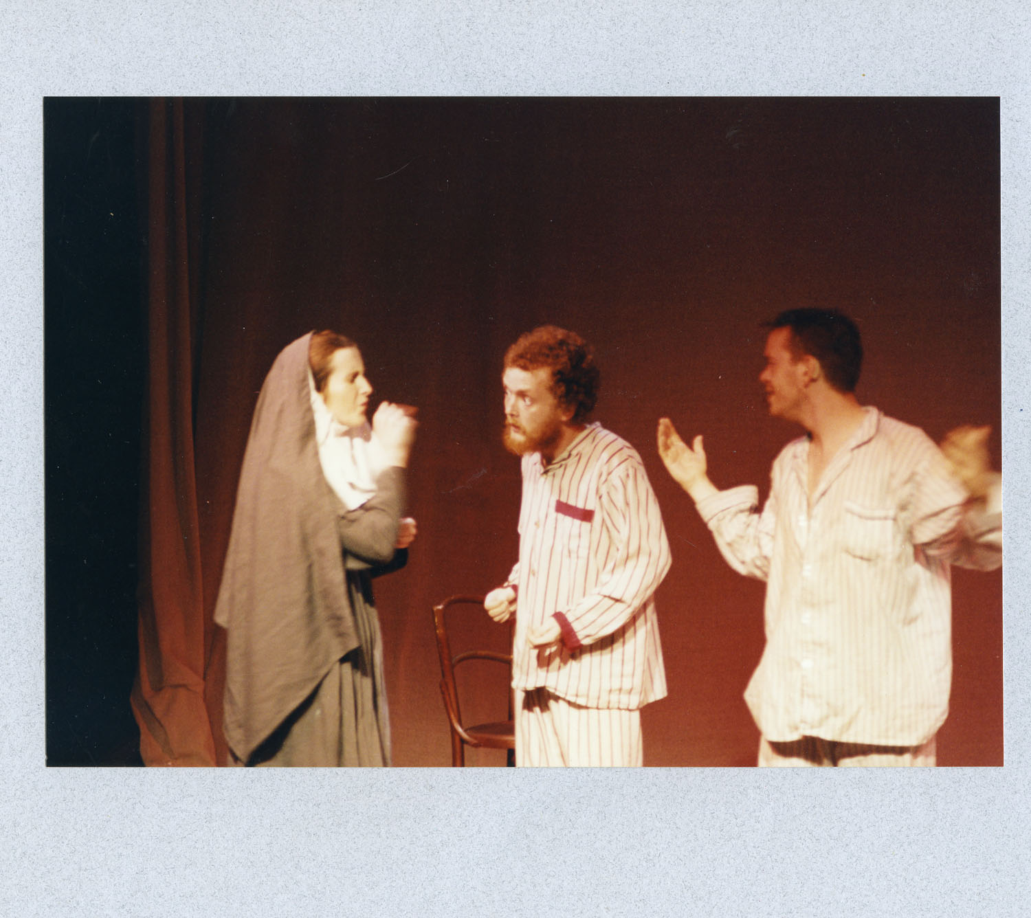 Colour photograph on grey cardboard of three actors in The Man With Two Kisses by Pan Pan Theatre Company