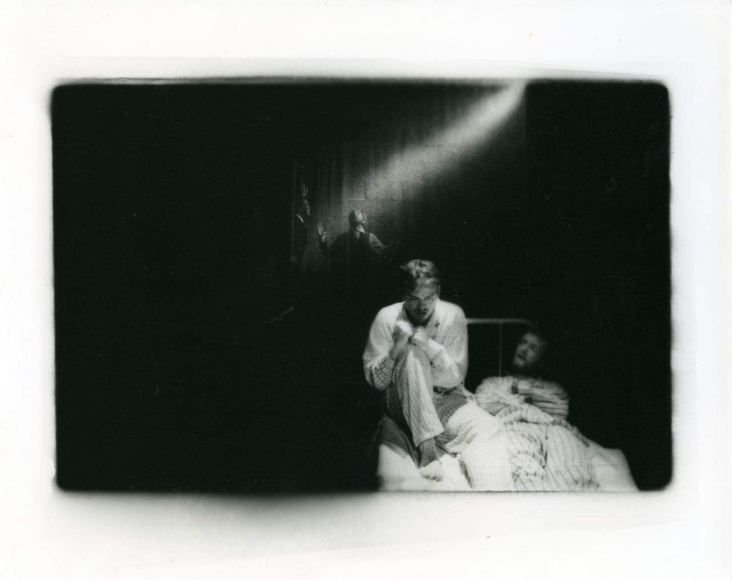 Black-and-white photograph of two actors in The Man With Two Kisses by Pan Pan Theatre Company