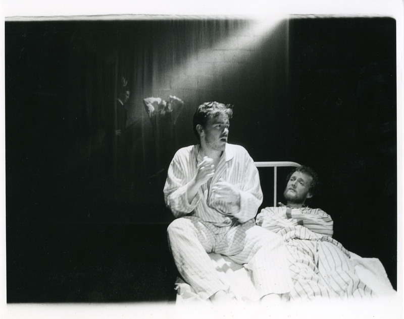 Black-and-white photograph of two actors in The Man With Two Kisses by Pan Pan Theatre Company