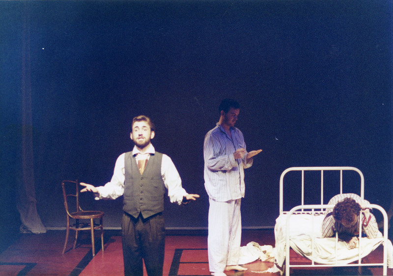 Colour photograph of three actors in The Man With Two Kisses by Pan Pan Theatre Company