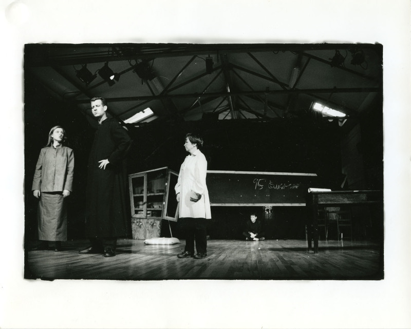 Black-and-white photograph of four actors, of which three prominent in the front of the stage, in Martin Assassin of his Wife by Pan Pan Theatre Company