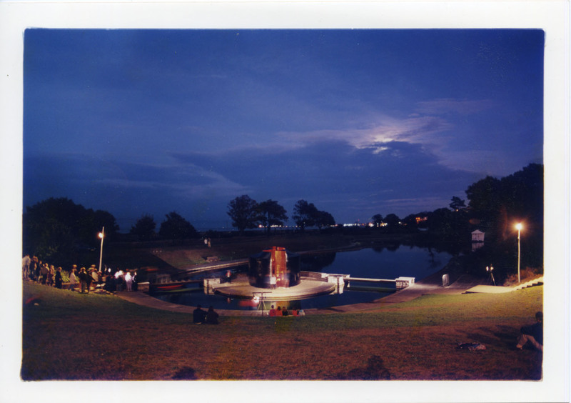 Colour photograph of Pan Pan Theatre Company's CITY venue, designed by Andrew Clancey, at night in Blackrock Park.
