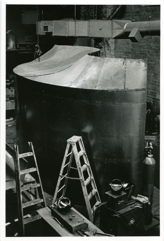 Black-and-white photograph of the workplace where the venue for Pan Pan Theatre Company's CITY was being constructed, based on designs by Andrew Clancey