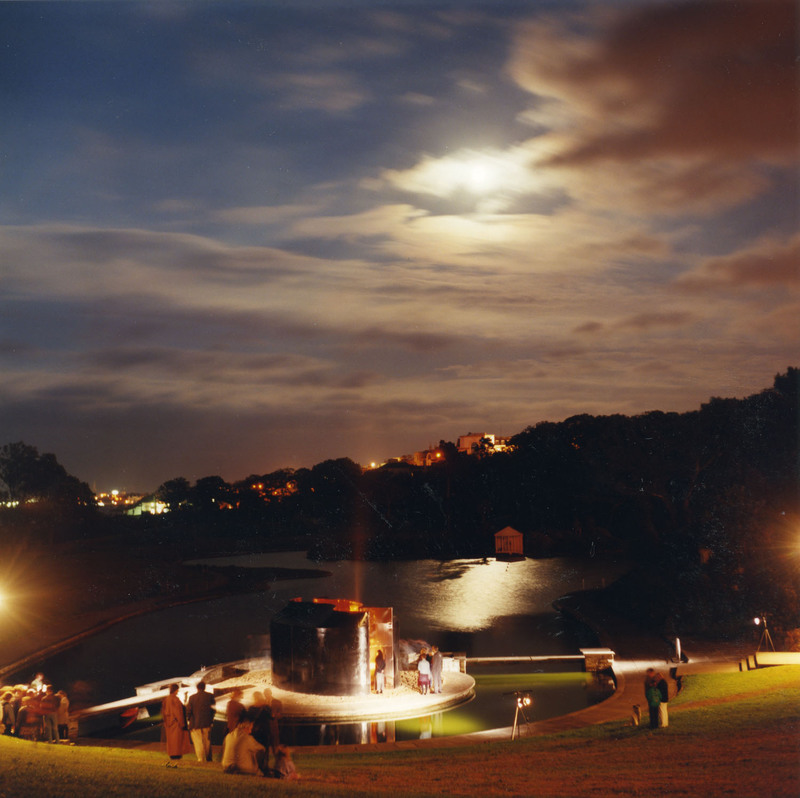 Colour photograph of Pan Pan Theatre Company's CITY venue, designed by Andrew Clancey, at night in Blackrock Park.