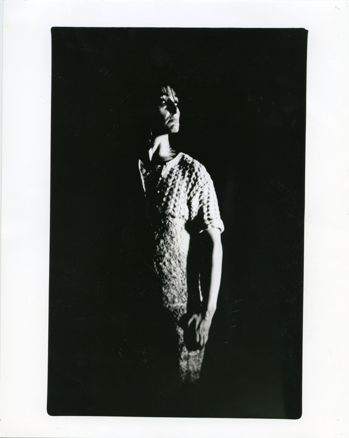 Black-and-white photograph of Patrizia Barbaggallo in Tailors Requiem by Pan Pan Theatre Company