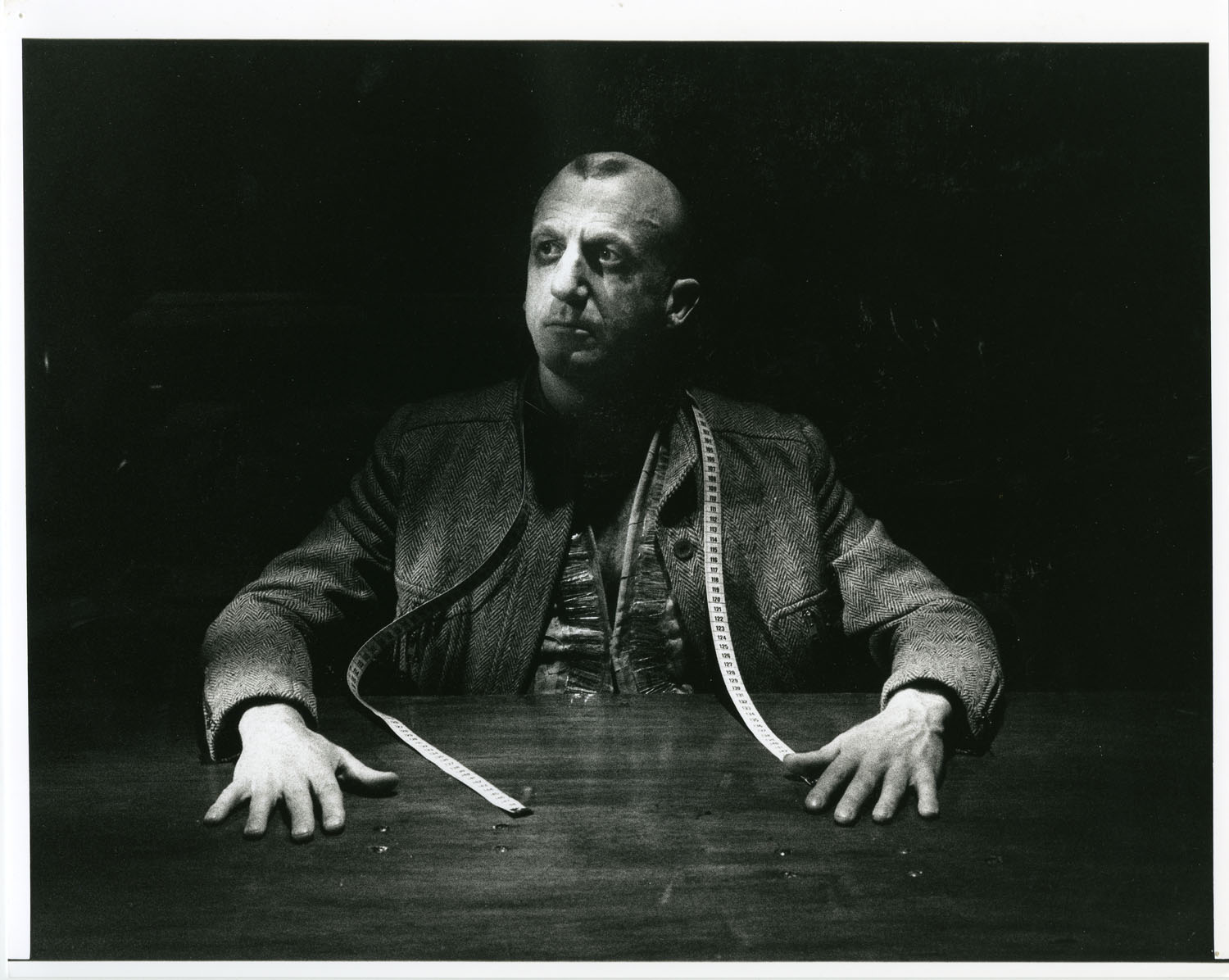 Black-and-white photograph of Charles Kelly as 'The Master' in Tailors Requiem by Pan Pan Theatre Company