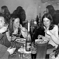Science Society Party, 1976 The picture shows five people, mostly 4th year Science students, around a table. The two women are eating food. There are others at tables in the background. The Science Society party was held possibly in the Fo’castle Ballad /Folk Club, Hotel Enda in Dominick Street. Participants’ names are given from left to right below: