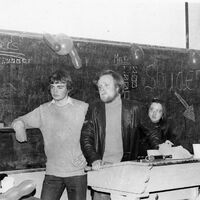 Biological Society Quiz, 1976 The occasion of a Biological Society Quiz during College Week in a lecture room setting. Two pictures are included with names given from left to right: