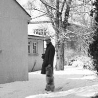 Snow covered Block R, 1969 The picture shows Tom Glynn (Experimental Physics), wearing a woollen cap, with his dog, standing outside the Block R Building (behind the Men's Club and boat house) in January 1969.