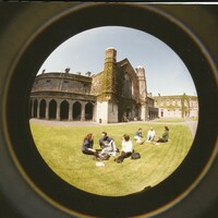 Quadrangle, early 1990s A porthole view of the Quadrangle, showing people, presumably students, sitting and relaxing on the lawn and others seated on benches in front of the Aula Maxima on a sunny day. The photograph probably dates from the early 1990s, as the ornate lamp standard erected at the centre of the Quadrangle in the late 1990s is not visible