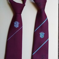 The College Tie These are the two versions of the College Tie. The original tie, on the left, is believed to have been introduced in the early 1970s. It was 55 inches in length and 3 inches at the widest point. Displayed on the blade, in white, were the College Arms (including the DEO FAVENTE motto), with a narrow white diagonal stripe underneath. That pattern was repeated on the back and, as shown in this image, on the neck (twice). The tie, carrying the Hortex label, was 100% polyester and made in Ireland.