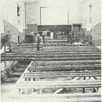 Greek Hall Conversion, 1980 - Athchóiriú Halla na Gréigise, 1980 Four men working on the conversion of the Greek Hall, with its tiered seating benches already seen to have been removed and work proceeding on removal of the substructure. Initially it was intended to become a flat-floored Council Chamber for Academic Council and Faculty meetings, but ultimately became the location for the administrative computing office.
