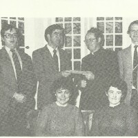 An Ciste Carthanachta, 1984-5 Distribution to a number of charitable organisations by An Ciste Carthanachta of funds it had raised from UCG staff. An Ciste Carthanachta (= 'The Charity Fund') was run by a staff committee as an annual fundraising drive among staff for a variety of charities. The photo was taken at the distribution of the £2,100 raised in 1984-5 to representatives of St Vincent de Paul Society (£500), An Cheathrú Rua Drowning Tragedy Fund (£100), the Parents and Friends Committee of the Holy Family Special School for Mentally Handicapped (Renmore), the Tagaste Youth Projects (£1,000), and the Simon Community (£100).