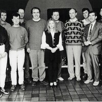 2nd row: Paul McBride (1990) with reddish hair; Unidentified (between two persons with glasses); Unidentified (between person with red shirt and woman); Unidentified (Below the 4th person on the left in back row); Unidentified (between person with white coat and the person with reddish hair and reddish tie); Gerard O’Connor (1989) with white top and glasses; Unidentified; John Geaney (1986)