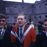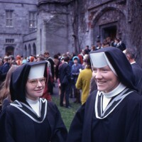 Nuns’ Graduation, 1968 Two Sister of Mercy nuns, Winifred Kearney (Sister Raphael) and Mary B. Forde (Sister Bernadette, probably) are shown left to right in the picture. They are wearing a habit with the coif headpiece (Wikipedia, Religious habit, 2024) and an academic hood. They graduated with an Honours B.Sc. Degree in Physics along with a Franciscan (James Malone), a Redemptorist (Brendan Callanan) and Tom Glynn (Tom Glynn, Asset Id 14665).