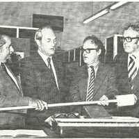 Opening of Applied Geophysics Unit, 1980 Image taken at the official opening of the Applied Geophysics Unit in the Quadrangle in 1980 by the Minister for Energy. This pioneering Unit (established as a Unit within the Department of Geology in the southeast corner of the Quadrangle, rather than as a separate Department) was set up, with special HEA funding, as the national Centre for education and research in applied geophysics. It aimed at providing education, training and research in geophysics applied to mineral and hydrocarbon exploration and exploitation, so that an indigenous pool of skilled personnel would be available to fill key jobs in Ireland's growing onshore and offshore exploration industry. Professor Andrew Brock was recruited as Professor of Applied Geophysics (1979-2000), and its flagship programme was the MSc in Applied Geophysics. In 2003, the Unit was merged with the Departments of Geology and Oceanography to form the new Department of Earth and Ocean Sciences.
