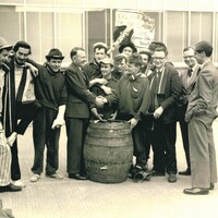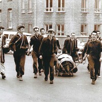 Students Barrel Roll from Galway to Dublin for charity. In response to a famine in the Congo, in 1961 a group of UCG students decided to roll a Guinness barrel from Galway to Dublin for charity. The bands fell off the barrel by the time they got to St. Patrick's Church, so they borrowed a pram and continued on their journey to Ballinasaloe, pushing the barrel in the pram. By then the pram had 'given up the ghost' and a local auctioneer replaced it. Along the route they collected money and were provided with free hotel accommodation and meals. At Kinnegad a local blacksmith had to do emergency repairs to the pram, but the group eventually arrived at St. James' Gate in Dublin (where the photo was taken) and presented Major General J. Sweeney, general secretary of the Red Cross, with the proceeds of their charity walk, £135 - a considerable sum. Messrs. Guinness presented them with the barrel as a souvenir, and it was later displayed in a glass case at UCG.