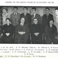 Coiste an Chumainn Éigse agus Seanchais 1957 – 58 The picture is that of Coiste an Chumann Éigse is Seanchais 1957-58, with names given in the picture caption. It includes an tOllamh Liam Ó Buachalla, Lecturer in Economics, Commerce and Accountancy (1928-1952), Prof. of Economics, Commerce and Accountancy (1952-1969). Cumann Éigse is Seanchais produced the irisleabhar FÍR, whose holdings are in Archives & Special Collections of the University of Galway Library. It contains holdings from 1941, Imleabhar (Volume) III, Uimhir (Issue) I to 1958, Imleabhar IV, Uimhir 12 (Geraldine Curtin, 2024). Interestingly, the Eagarthóir (Editor) and Fo-Eagarthóir (Sub-Editor) of the 1941 – 42 Uimhir III, Irisleabhar FÍR was Seán Mac Réamoinn and Siobhán Nic Cionnaith.