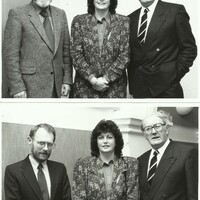 Máire Geoghegan-Quinn in the College to deliver the annual Bord na Gaeilge lecture in 1988. She was Minister of State in the Department of the Taoiseach at the time. With her in the upper photograph are the President of the College and the Professor of Modern Irish. With her in the lower photograph are the President of the College and the Professor of Economics.