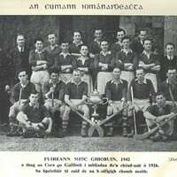 Fitzgibbon Hurling Team of 1942 The picture shows eighteen men dressed in sports gear, with the front eight men holding hurling sticks or 'camáns'. Four of the men were Oifigí or Officers of the UCG Hurling Club, who were more formally dressed with ties. It was the occasion of the UCG Hurling Club winning the Fitzgibbon Cup (Wikipedia, Fitzgibbon, Apr. 2024) for the first time since 1926. The picture was taken by William Dowler, professional photographer, Presentation Road, Galway.