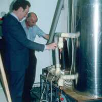 Inspecting Physics equipment, 1982 Tom O'Connor (left) and Frank Gaffney inspecting some equipment, most probably connected with Atmospheric Physics research.