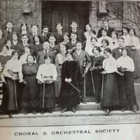 University Choral & Orchestral Society, 1915 The first picture shows a combined group of orchestral people along with a choral group. The second picture shows the choral group on their own. Music notes describing some of their activities and renditions is given in an article ‘Music Notes’ (UCG Annal, 1915-16). Miss Fogarty was appointed Conductor of the University Choral & Orchestral Society in the first term of academic year 1915-16. The article described preparations for the upcoming Concert in the Town Hall. Rehearsals took place in the Greek Hall. A tour de force of the Choir was the Miserere scene from ‘Il Trovatore’. A minor hiccup occurred with the news that three or four prominent Society members were going to Cork to play in the Camogie Ashbourne Cup competition.