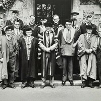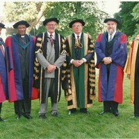 NUI Honorary Degree Conferring in UCG, 1995 Group photograph of four recipients of honorary doctorates from the NUI, together with the Chancellor of the NUI and the President of UCG, at the conferring of those degrees in UCG by the Chancellor on June 26, 1995. Those recipients and the degree conferred on each were as follows: Michael J. Roarty (LLD ), Archbishop Wilfrid F. Napier (LLD), Nicholas Robinson (LLD) and Seán Ó Lúing (DLittCelt).