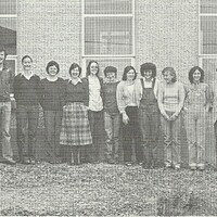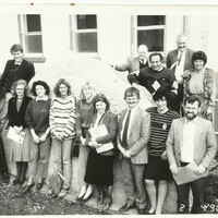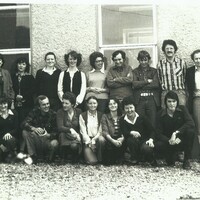 Cúrsa Gaeilge do Lucht Riaracháin agus eile, Áras Mháirtín Uí Chadhain, deireadh na 1970idí / Irish-language course for Administrative Staff and others, Áras Mháirtín Uí Chadhain, late 1970s Grúpa d'fhoireann riaracháin na hOllscoile, ón Leabharlann go háirithe, móide roinnt mac léinn a d'fhreastail ar bhonn deonach ar chúrsa Gaeilge in Áras Mháirtín Uí Chadhain ag deireadh na 1970idí. / A group of administrative staff of the University, mostly from the Library, and some students who attended an Irish-language course in Áras Mháirtín Uí Chadhain in the late 1970s.