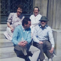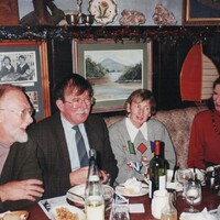 A Medical Group Gathering, 1989-1991 Sean Lavelle, Dept. of Experimental Medicine (on the right of the picture) is sitting on steps alongside Parnell Keeling , Dept. of Surgery. At the rear is Joan Kavanagh (left of picture), Research Assistant, Dept. of Experimental Medicine alongside Frances Lavelle, wife of Sean Lavelle.