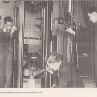 Testing concrete quality in 1939 The picture shows four engineering students testing concrete in the Engineering Laboratory in 1939 (NUI Galway Staff Book, 2000 – 2001)