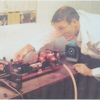 Picture 1 shows Dr Glynn adjusting the output of the red beam of the dye laser in the foreground, which is being driven by the green beam of the argon laser in the background. This system was a valuable and effective tool in the research of several Ph.D students over the following years. By 1989, Dr Glynn had developed an interest in lasers of higher power which could be used in industry for cutting, welding, drilling, marking, and lots of other applications. This led to the setting up of the National Centre for Laser Applications (NCLA), assisted by a strategic research grant from EOLAS (a fore-runner of Enterprise Ireland).