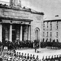 Galway Courthouse 1910, King George V Proclamation The accession of King George V to the throne was proclaimed in Galway Courthouse at 2 pm on 21 May, 1910, following the death of Edward VII. The ceremony was performed by the High Sherriff, Mr. Cecil R. Henry (www.kennys.ie, 2016). A picture shows the scene outside of Galway Courthouse (Semple, 1969). About one hundred men of the Connaught Rangers, under Major Sarsfield, were formed up in line opposite the Courthouse, and an equal number of the Royal Irish Constabulary (www.kennys.ie, 2016), whose bayonets are shouldered, and under the command of the Head Constable, Charles Carlos. Family tradition (P. Larkin, personal communication) has it that the two white figures at the base of the Courthouse steps in the picture were likely Charles Carloss’ daughters – Rita and Nina Carlos. Their confirmation picture in about 1910-12, with Rita on the left, is also shown. That picture was taken In Slater's Studio, Ballina, Co. Mayo in the period between 1910 - 12, (P. Larkin, Personal communication).