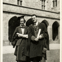 Two new medical graduates, 1950 or 1951 Portrait of Eileen O'Cleary and friend on the day they received their medical degrees.
