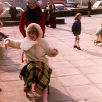 College Week Bonny Baby Competition, 1974 Dolores Monaghan (BA 1976, H.Dip Education 1977) is the 'mother' wheeling Pat Hoade (BSc 1976, PhD 1982) in Eyre Square where the competition was held.