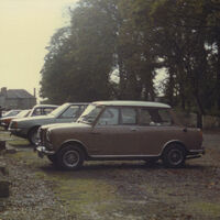 Carpark outside old Microbiology prefabs (on site of Martin Ryan Building) This was a carpark , on a rough surface, outside the old Microbiology prefabs, on the road leading to the former Irish Metal Industries (IMI) factory where the Martin Ryan Building (now part of the Ryan Institute) was soon to be erected.. The view is towards the Canal, and part of the stairway into this prefab is visible at the left. The car nearest to us is a Wolseley Hornet.