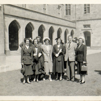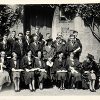 Medical graduates on Conferring Day, 1950 or 1951 In this photograph, taken in the Quadrangle, the only person who has been identified is Eileen O'Cleary (front row, 4th from left). The older man in the centre of the photograph may be either the Dean of Medicine or the President of the University.