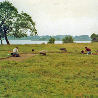 Ballaghkeeran Archaeological Dig, 1982 The picture shows archaeological fieldwork in progress in the townland of Ballaghkeeran Little, Barony of Kilkenny West, on the S.E. shores of Lough Ree, County Westmeath. Four persons are involved including one woman. The excavation fieldwork was under the direction of Dr. Tom Fanning, Department of Archaeology, University of Galway.