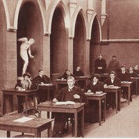 Examination candidates in the Aula Maxima, 1909 A picture of examination candidates in the Aula Maxima in 1909 is shown here, which includes partial images of three other candidates. Two persons in the backgound may be examination supervisors, one of whom looks like a priest – possibly Revd T.R. Mac Alinney, the Catholic Dean of Residence at the time. Two Roman style sculptures mounted on pedestals between Aula Maxima arches can also be seen.