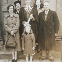 Graduation of Tony Bromell in 1954 The image is of Tony Bromell from Limerick, who graduated with a BA in 1954, with his parents and other family members on the steps to the entrance to the Aula Maxima in the Quadrangle, UCG. Tony was the first person from his family to graduate from university, and his entire family travelled to Galway for the ceremony in a taxi that was hired for the purpose.