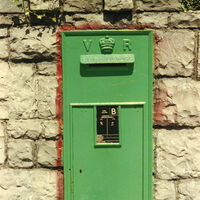 Victorian postbox, University Road, Galway This is a Victorian postbox from the period 1887-1901, set into the cut limestone southern boundary wall of the University on University Road, Galway. The first postboxes (pillar boxes) were introduced in the Channel Islands in 1852 for the Post Office by Anthony Trollope (the later novelist who had also worked in Ireland for the Post Office) for the convenience of people at a distance from a post office. They reached Ireland in 1855. Smaller postboxes set into a wall were introduced in 1857. A new design was introduced in 1887, incorporating the royal cypher - at that time the letters VR (= Victoria Regina) with the Royal Crown between them - on the door and the words ‘Post Office’ on the hood above the aperture for letters. From the royal insignia on this postbox, it can be dated to the period 1887-1901.