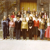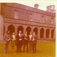 Evening BA class with Department of English staff, early 1980s Evening BA class with three academic staff from the Department of English in front of the Aula Maxima, Quadrangle, UCG.