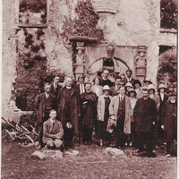 Group outing to Menlo Castle, 1924 The picture shows a group of twenty two people outside the ornate frontal façade of Menlough Castle, locally more usually referred to as Menlo Castle (Sites and Monuments Record Number GA082-064). It is located alongside the river Corrib, and about 5 km north - northwest of Galway City. The group include Rita Carlos and Patt Larkin, graduates of UCG, in the second row from the top, positioned 5th and 6th respectively from the left hand side.