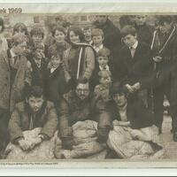 Rag Week, 1969 - Sleep-in A fundraising charity sleep-in at Eyre Square, Galway during UCG Rag Week in February 1969. Two of the group are wearing the UCG scarf of maroon, white and green.