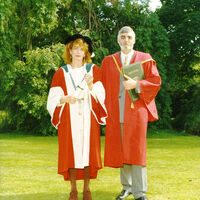 This was the first honorary degree conferred on Edna O'Brien by any University. It was generally seen as overdue recognition of a writer whose controversial early novels in the 1960s, rooted in the religion-dominated Irish rural society of her girlhood, had been banned in Ireland. A photograph of her chatting on this occasion with the Bishop of Killaloe, Most Rev. Dr Michael Harty, who was Clare Co. Council's representative on the Governing Body at the time, was thus seen by many as reflecting the change in Irish society since that time. That belated sense of acceptance was echoed in Miriam Lord's report, following her interview of Edna after the conferral, under the headline 'Country Girl Goes Home', published in the Irish Independent of July 2, 1991.