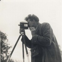Taking a picture in Aran, 1954 Patt Larkin, Professor of Education, visiting the Aran Islands in 1954 as a member of the Education Film Unit (Aonáid Scannáin, Ollscoile na Gaillimhe). The picture shows Patt Larkin taking a picture with a camera mounted on a tripod. It was an 8mm movie camera.